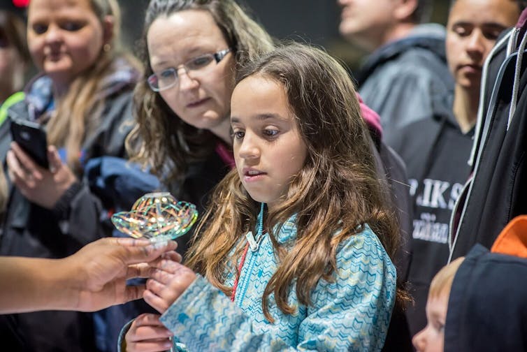 Una madre ayuda a su hija en el festival de ciencia Science Rendezvous Kingston 2017. (Garrett Elliott)